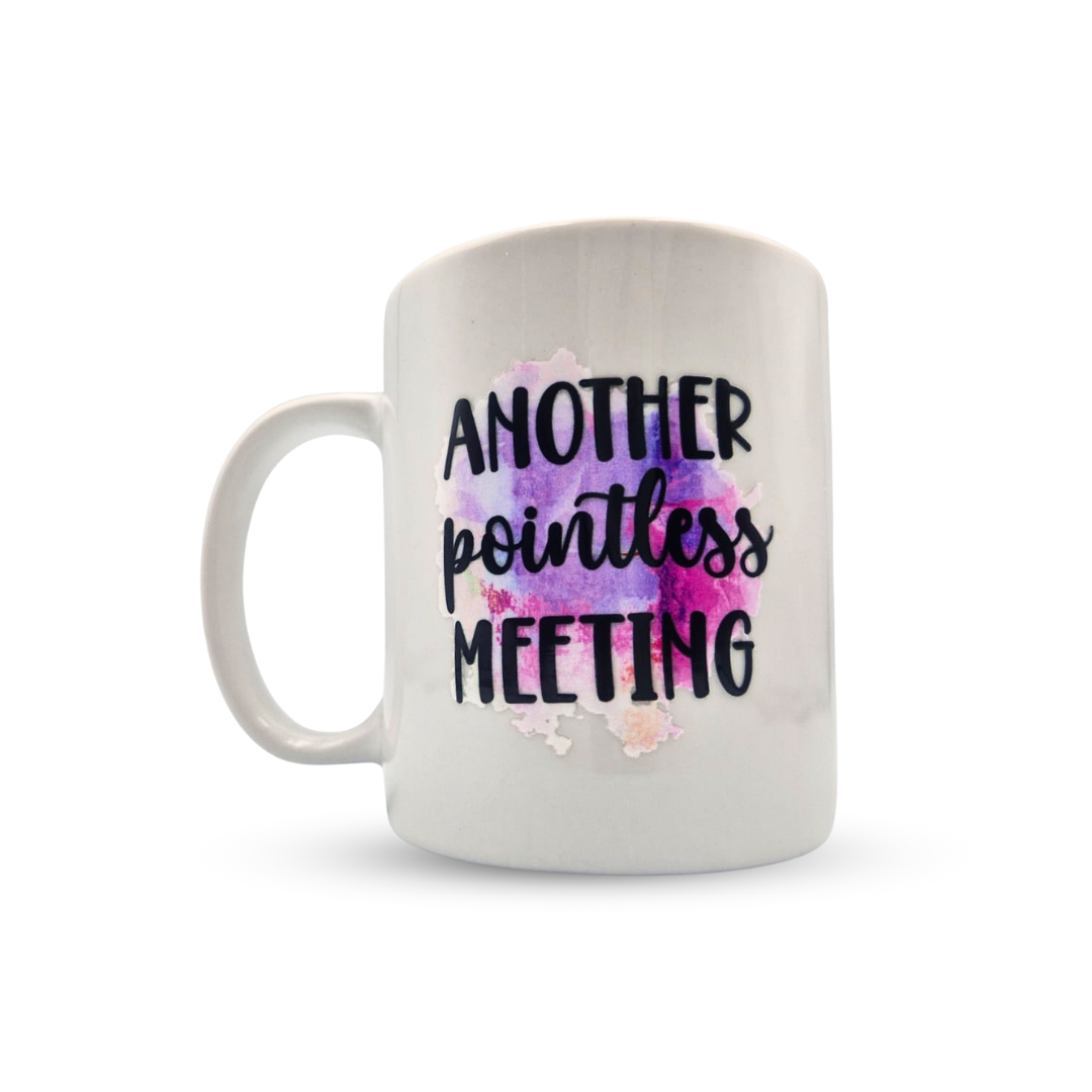 Make a statement at your next meeting with our "Another Pointless Meeting" Mug! Designed for those who know the struggle, this sleek white ceramic mug features a playful watercolour splash background paired with bold typography. Whether you're sipping coffee or tea, this mug adds a touch of humour to your work routine.