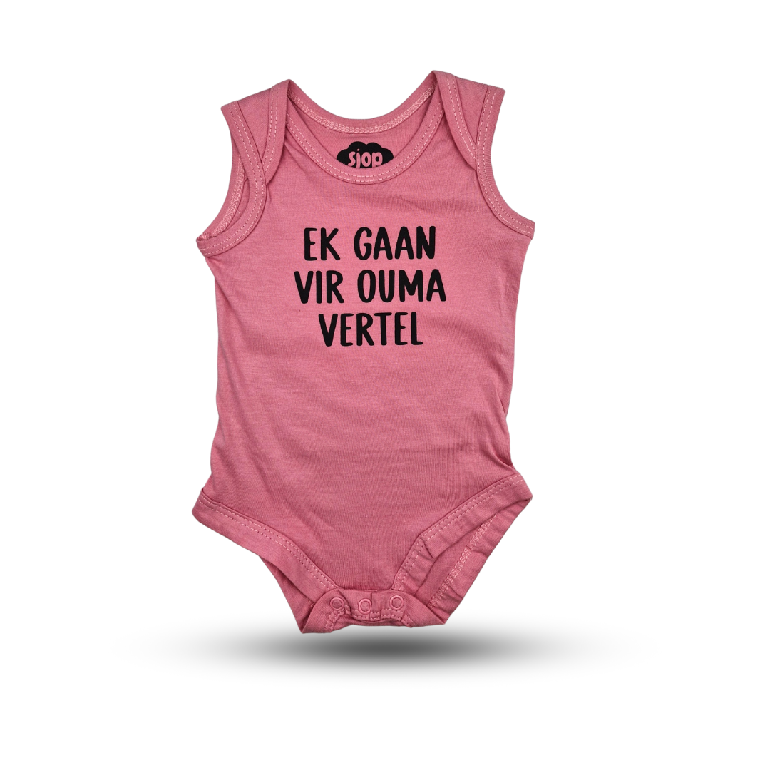 This ultra-cute cotton babygrow features the iconic phrase “Ek gaan vir ouma vertel” in bold vinyl print, perfect for the little snitch-in-training who's already got grandma wrapped around their teeny-tiny finger.