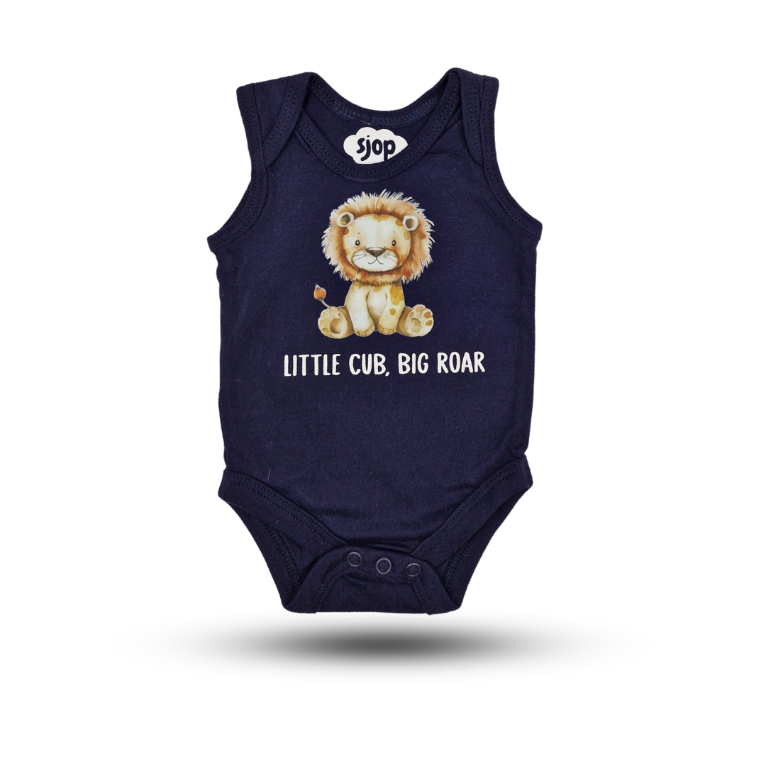 Featuring bold vinyl text that reads “Little Cub, Big Roar”, this piece is printed on 100% soft, breathable cotton — gentle on sensitive skin but strong enough for wild adventures (like crawling into the dog’s bowl). Easy snap buttons and a comfy envelope neckline mean quick changes between growls and giggles.