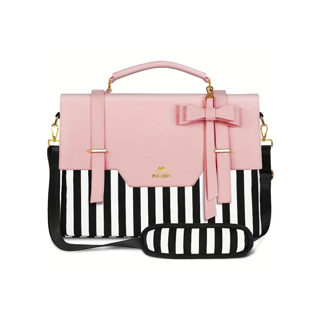 - Stylish Design: The sophisticated pink and black striped exterior, complemented by golden-toned hardware and a chic bow detail, makes this laptop bag a standout accessory.