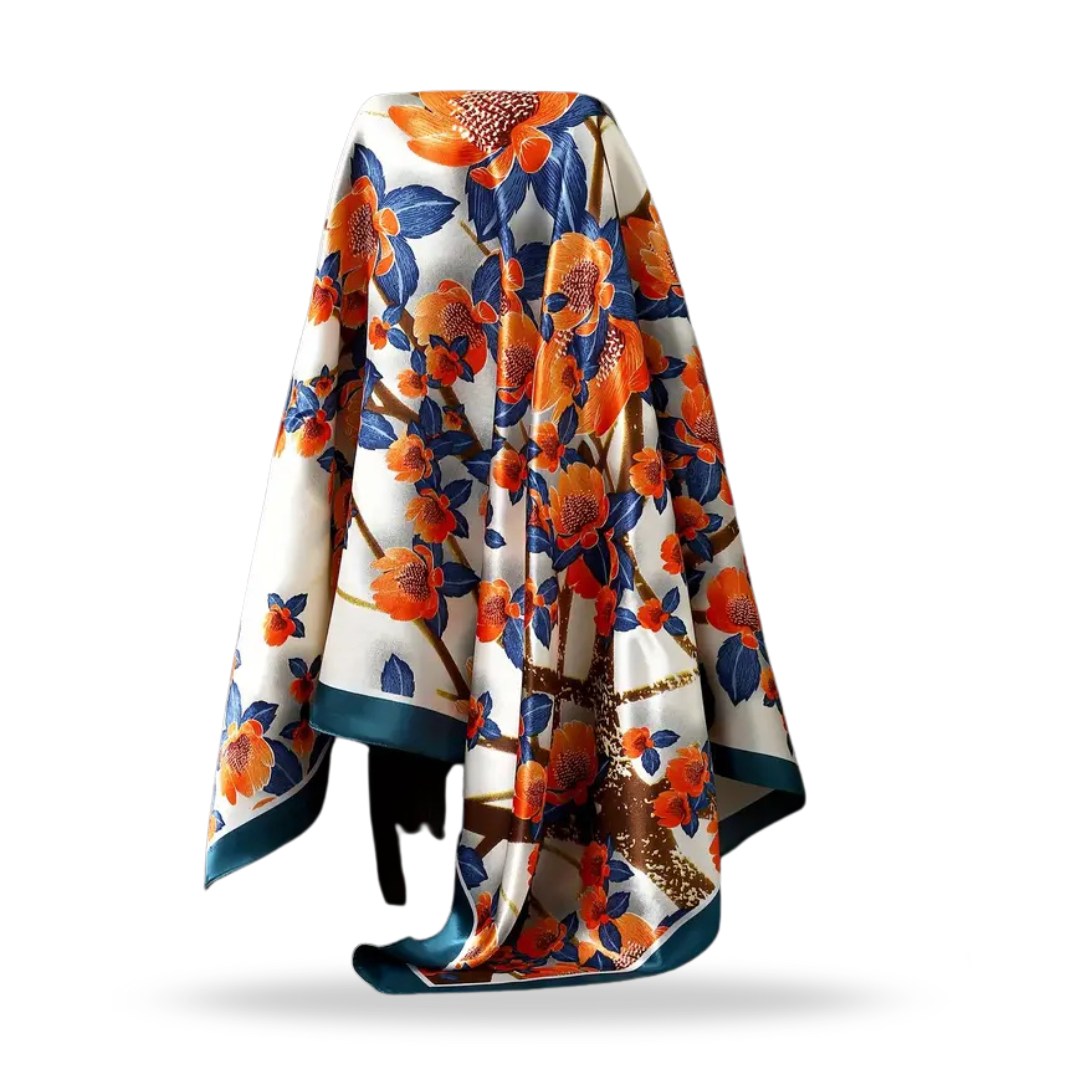 Satin Square Flower Scarf (Blue, Orange & White)