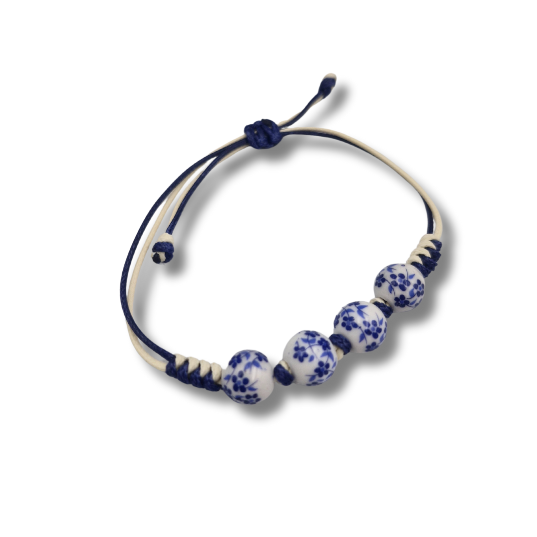 - Design: Four hand-painted blue porcelain beads on a delicate string bracelet