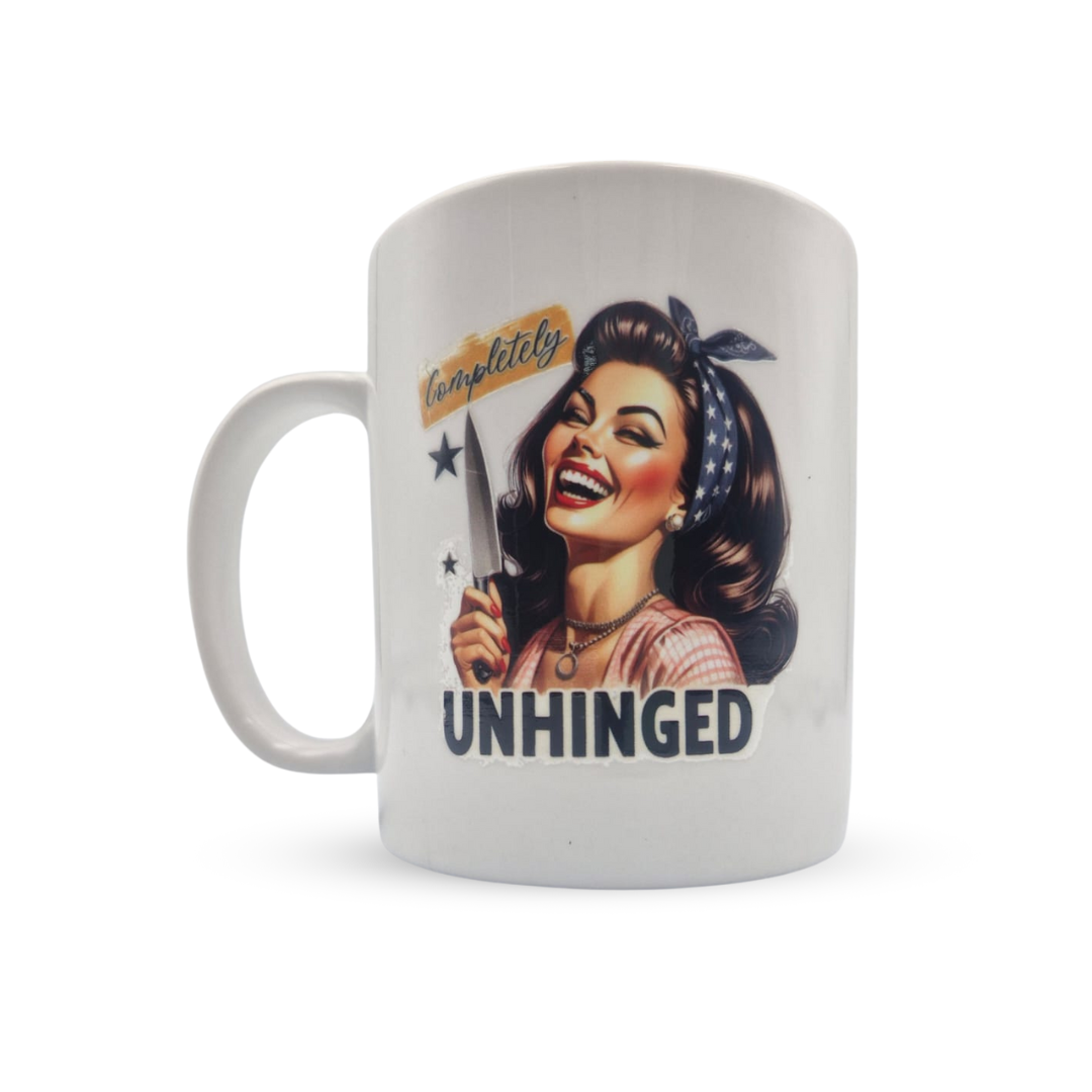Start your day with a sip of coffee and a side of chaos! This quirky white mug features a vintage pin-up girl holding a knife, paired with the bold word "Unhinged"—because why hide the madness? Perfectly balancing retro charm with a wicked sense of humor, this mug is the ultimate conversation starter. Whether you're fueling up for the day or embracing your slightly unhinged side, this mug has got you covered.