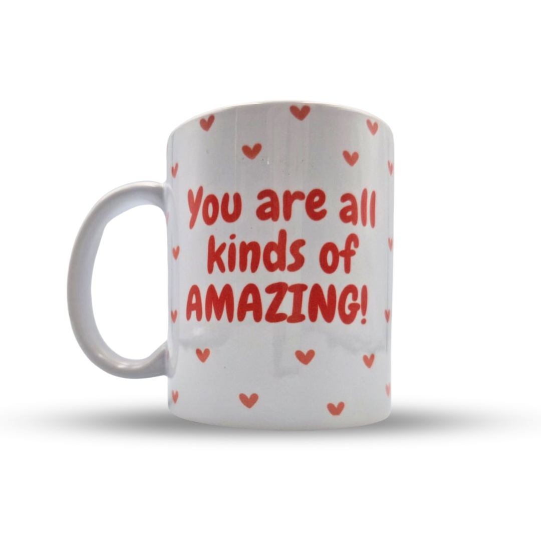 Start every morning with love and positivity! This charming white mug features sweet messages – "You are all kinds of amazing" on one side and "I love you" on the other, surrounded by delicate heart designs. Whether it's a romantic gift, a daily reminder of self-love, or a thoughtful surprise for a loved one, this mug is sure to warm both hearts and hands.